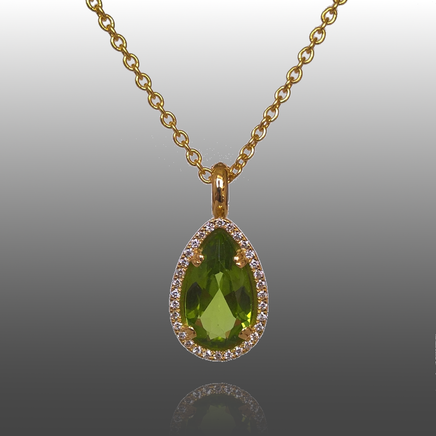 A one-of-a-kind pendant with a spectacular pear shape peridot, set into 18k gold and framed with diamonds. A hinged clip-on bail allows for wearing the pendant with different chain options.