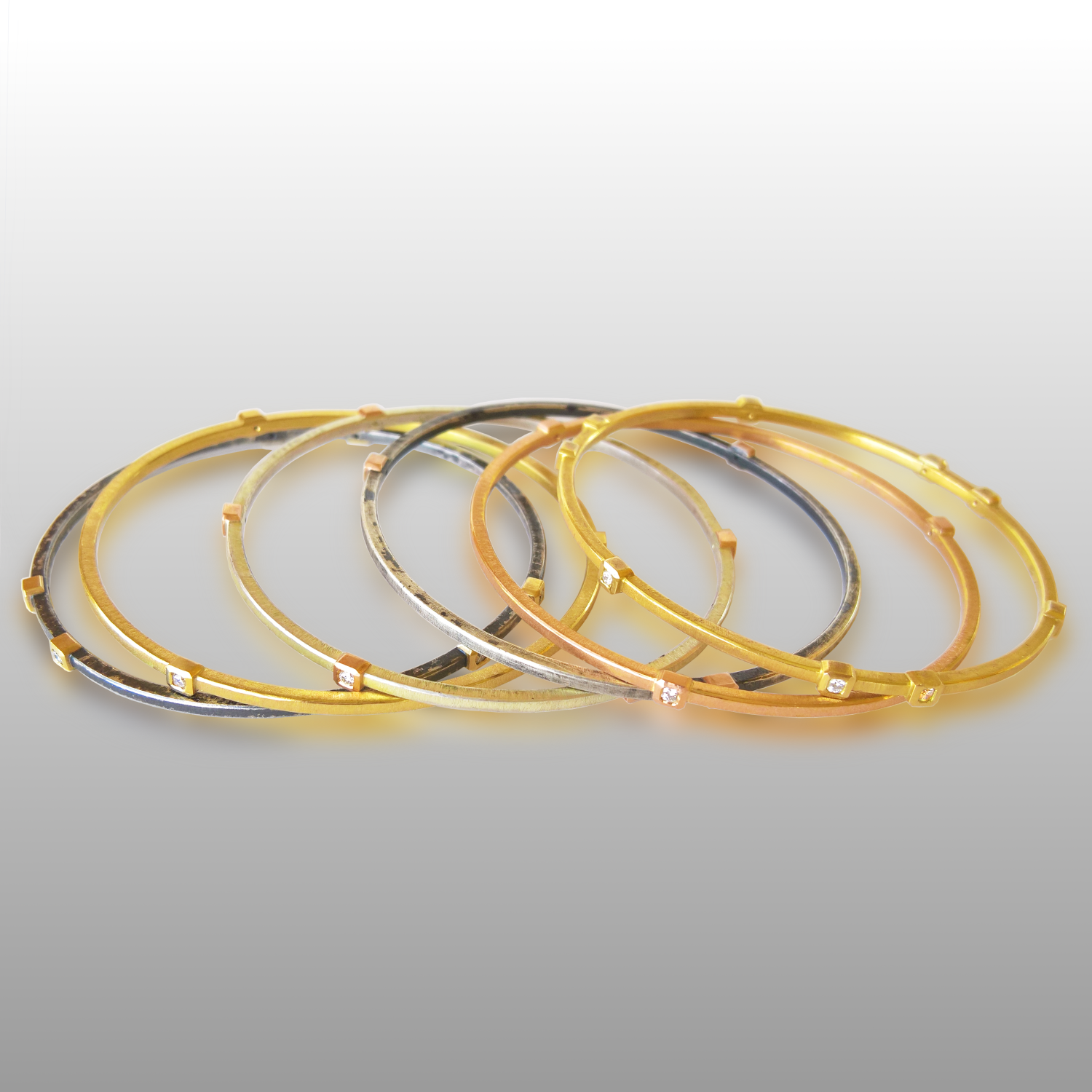 Made to order in sterling silver, in 18k yellow and 18k rose gold and in platinum. Bangles feature 3, 6, 9 or 12 round diamonds that are bezel set in 18k yellow or rose gold or in platinum. Different arrangements of the settings are possible.